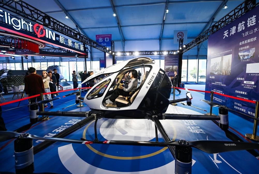 10月16日,觀眾在天津直博會低空經(jīng)濟館內(nèi)體驗一款eVTOL(電動垂直起降飛行器)。新華社記者 趙子碩 攝