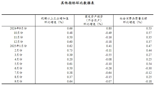 (2)根據(jù)季節(jié)調(diào)整模型自動(dòng)修正結(jié)果,對(duì)近一年來各期國(guó)內(nèi)生產(chǎn)總值、規(guī)模以上工業(yè)增加值、固定資產(chǎn)投資(不含農(nóng)戶)、社會(huì)消費(fèi)品零售總額環(huán)比增速進(jìn)行修訂。修訂結(jié)果及2025年三季度GDP環(huán)比數(shù)據(jù)、2025年9月份其他指標(biāo)環(huán)比數(shù)據(jù)如下: