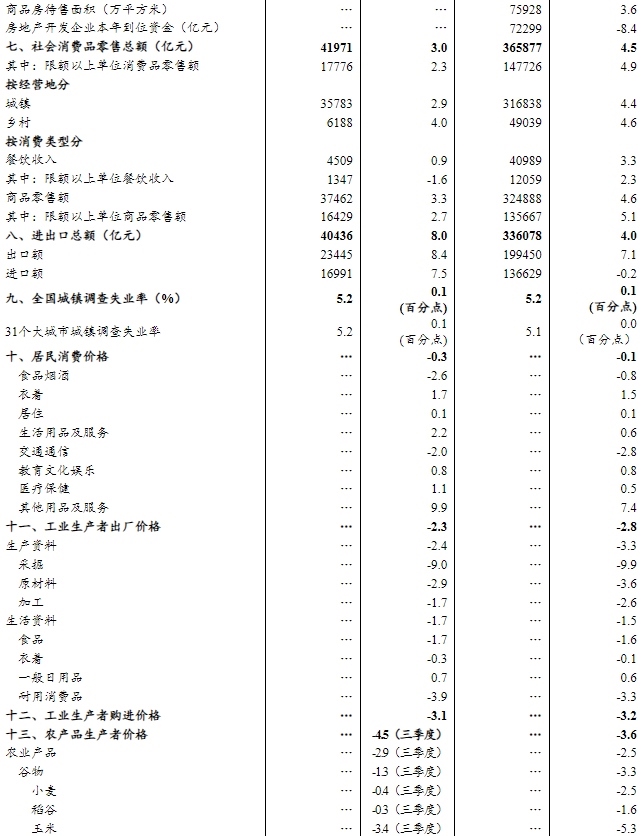 總的來看,前三季度穩(wěn)就業(yè)穩(wěn)經(jīng)濟(jì)政策舉措接續(xù)發(fā)力,主要宏觀指標(biāo)總體平穩(wěn),經(jīng)濟(jì)運(yùn)行保持穩(wěn)中有進(jìn)態(tài)勢(shì),高質(zhì)量發(fā)展取得積極成效。也要看到,當(dāng)前經(jīng)濟(jì)運(yùn)行仍面臨不少風(fēng)險(xiǎn)挑戰(zhàn),外部不穩(wěn)定不確定因素較多,國(guó)內(nèi)經(jīng)濟(jì)回升向好基礎(chǔ)仍需加力鞏固。下階段,要堅(jiān)持以習(xí)近平新時(shí)代中國(guó)特色社會(huì)主義思想為指導(dǎo),全面貫徹落實(shí)黨中央決策部署,堅(jiān)持穩(wěn)中求進(jìn)工作總基調(diào),推動(dòng)更加積極有為的宏觀政策落地增效,著力穩(wěn)就業(yè)、穩(wěn)企業(yè)、穩(wěn)市場(chǎng)、穩(wěn)預(yù)期,扎實(shí)推動(dòng)高質(zhì)量發(fā)展,促進(jìn)經(jīng)濟(jì)持續(xù)健康發(fā)展。