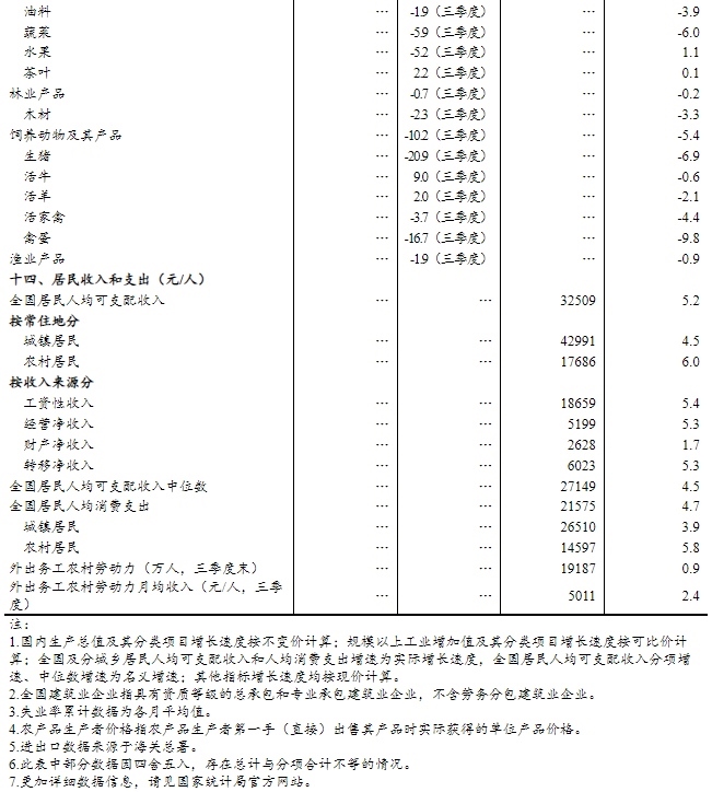 前三季度,全國(guó)居民人均可支配收入32509元,同比名義增長(zhǎng)5.1%,扣除價(jià)格因素實(shí)際增長(zhǎng)5.2%。按常住地分,城鎮(zhèn)居民人均可支配收入42991元,同比名義增長(zhǎng)4.4%,實(shí)際增長(zhǎng)4.5%;農(nóng)村居民人均可支配收入17686元,同比名義增長(zhǎng)5.7%,實(shí)際增長(zhǎng)6.0%。從收入來源看,全國(guó)居民人均工資性收入、經(jīng)營(yíng)凈收入、財(cái)產(chǎn)凈收入、轉(zhuǎn)移凈收入分別名義增長(zhǎng)5.4%、5.3%、1.7%、5.3%。全國(guó)居民人均可支配收入中位數(shù)27149元,同比名義增長(zhǎng)4.5%。