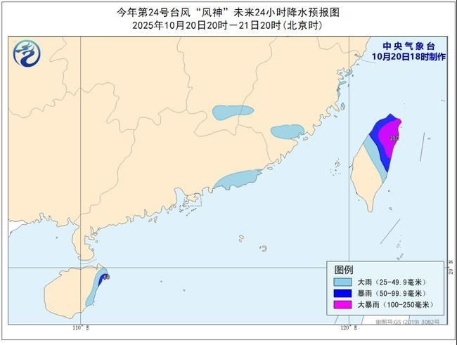 降水預(yù)報:20日20時至21日20時,福建東北部和南部、江西南部、廣東東南部沿海、海南島東部、臺灣島中北部有大到暴雨,臺灣島北部局地有大暴雨(100-250毫米)。