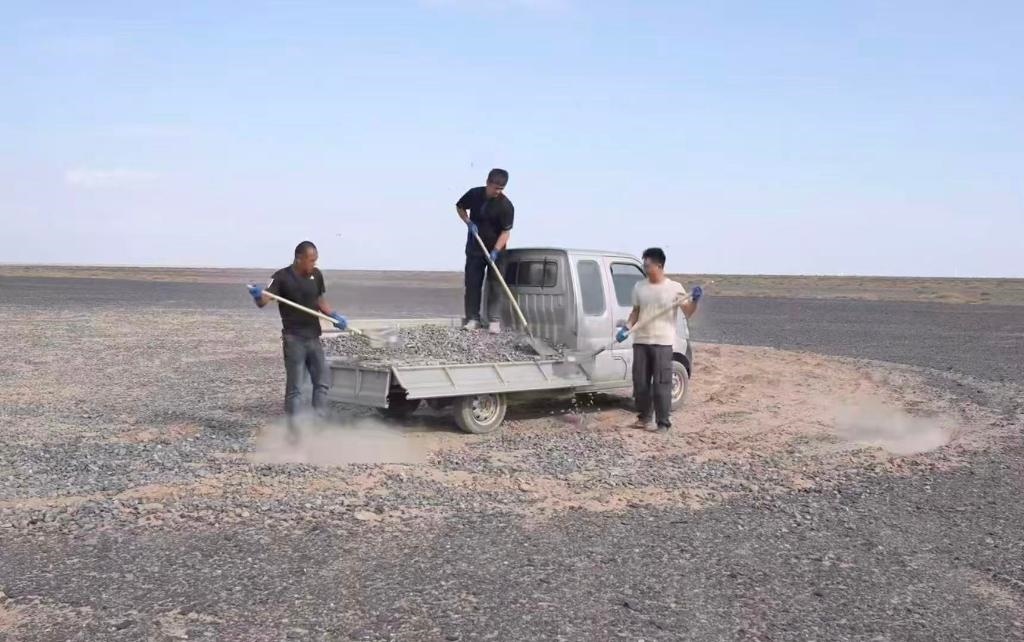 “看到車輪碾過(guò)標(biāo)語(yǔ)那一刻,就像碾在歷史的脊梁上?!本W(wǎng)絡(luò)博主陸遙得知標(biāo)語(yǔ)被破壞后,主動(dòng)驅(qū)車兩千多公里,經(jīng)歷六天抵達(dá)哈密。他和朋友們拉運(yùn)20噸砂石,才終于修復(fù)這些“疤痕”。