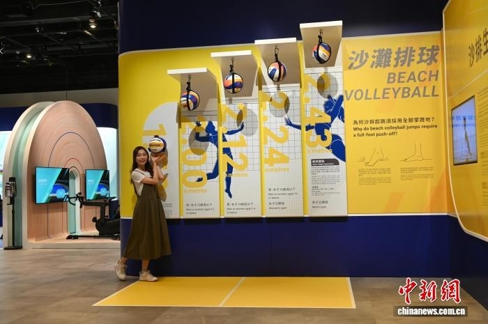 10月23日,香港科學(xué)館舉辦“國(guó)家發(fā)展成就系列──臻至完美:運(yùn)動(dòng)與科學(xué)的交匯”展覽,展示全國(guó)運(yùn)動(dòng)會(huì)的歷史及第十五屆全國(guó)運(yùn)動(dòng)會(huì)香港賽區(qū)的賽事項(xiàng)目。圖為一名女士體驗(yàn)沙灘排球項(xiàng)目,了解運(yùn)動(dòng)員的跳躍高度。 中新網(wǎng)記者 李志華 攝