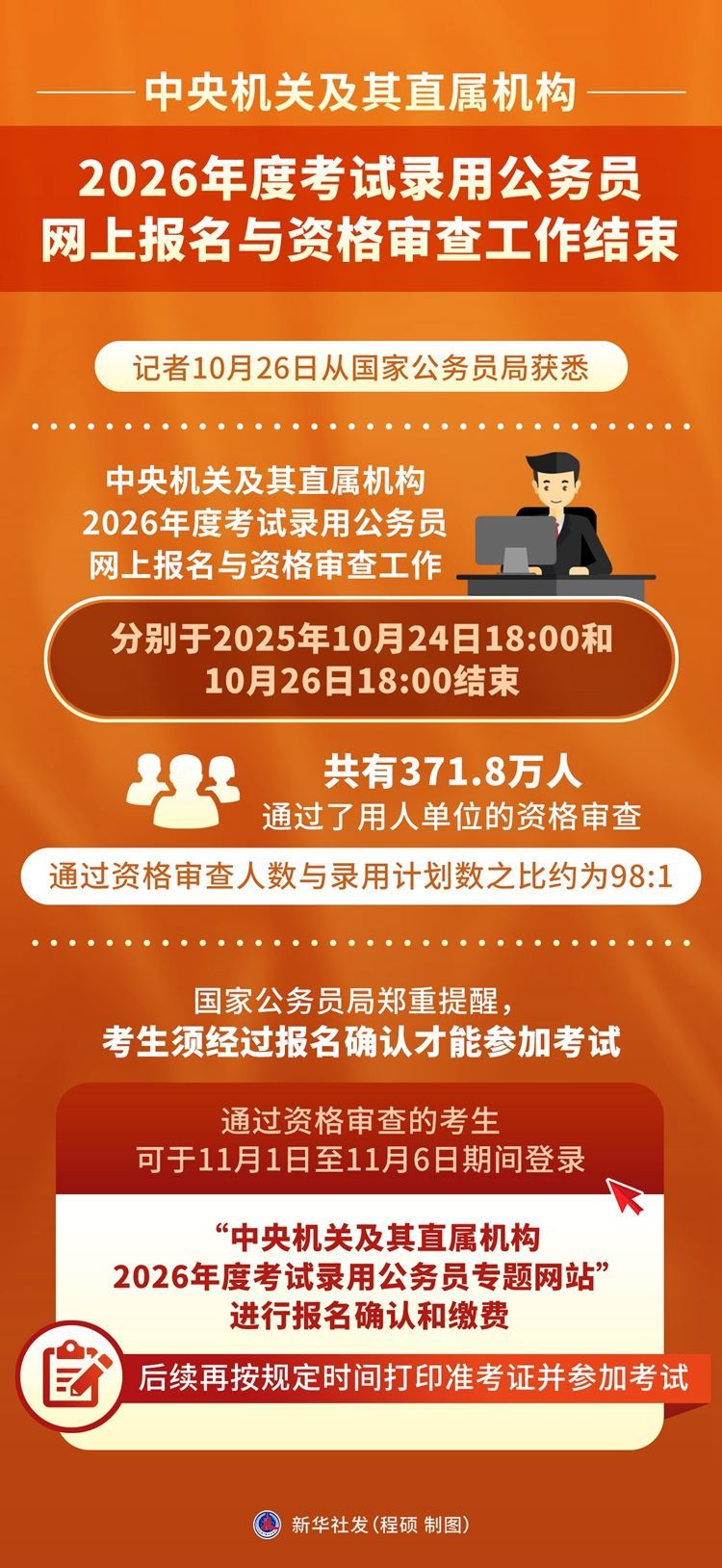 國家公務(wù)員局鄭重提醒,考生須經(jīng)過報名確認才能參加考試。通過資格審查的考生可于11月1日至11月6日期間,登錄“中央機關(guān)及其直屬機構(gòu)2026年度考試錄用公務(wù)員專題網(wǎng)站”進行報名確認和繳費,后續(xù)再按規(guī)定時間打印準考證并參加考試。