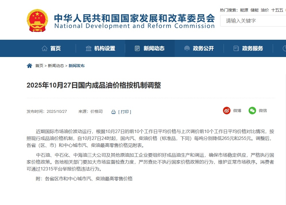 中國網(wǎng)10月27日訊 據(jù)國家發(fā)改委網(wǎng)站消息,近期國際市場油價(jià)波動(dòng)運(yùn)行,根據(jù)10月27日的前10個(gè)工作日平均價(jià)格與上次調(diào)價(jià)前10個(gè)工作日平均價(jià)格對比情況,按照現(xiàn)行成品油價(jià)格機(jī)制,自10月27日24時(shí)起,國內(nèi)汽、柴油價(jià)格(標(biāo)準(zhǔn)品,下同)每噸分別降低265元和255元。調(diào)整后,各省(區(qū)、市)和中心城市汽、柴油最高零售價(jià)格見附表。