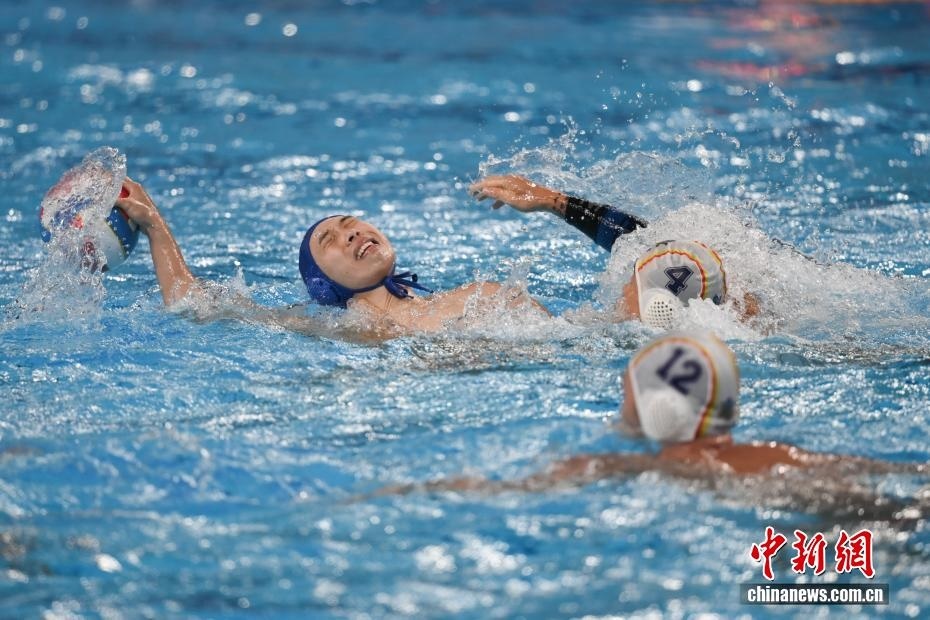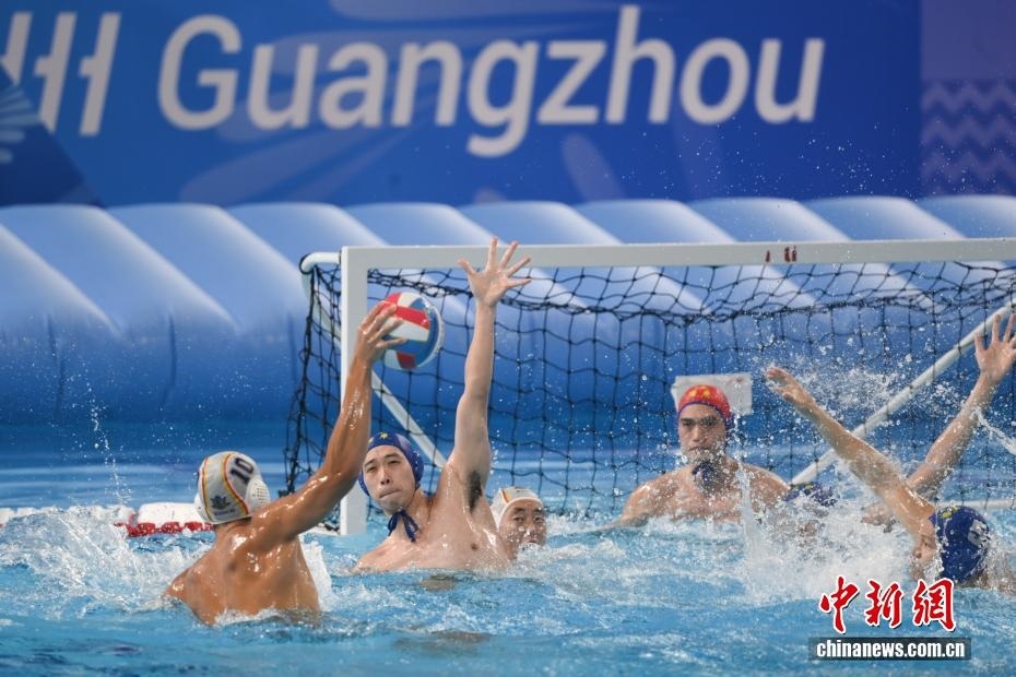10月27日晚,在廣東廣州舉行的第十五屆全國運動會水球男子組比賽金牌賽中,廣東隊(藍(lán)帽)以16比9戰(zhàn)勝上海隊(白帽),獲得金牌。圖為上海隊10號運動員楊尚霖在比賽中進攻。