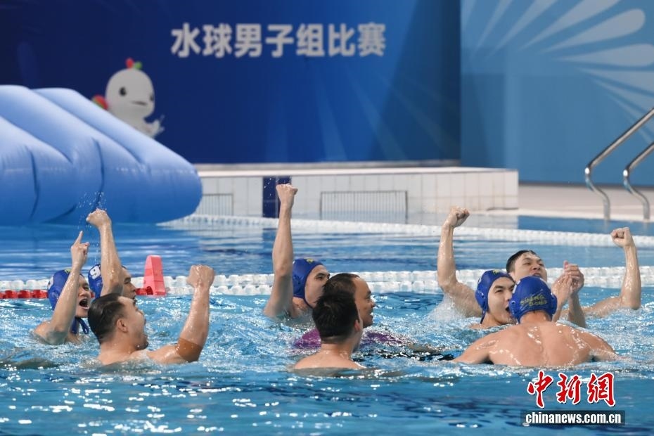 10月27日晚,在廣東廣州舉行的第十五屆全國運動會水球男子組比賽金牌賽中,廣東隊以16比9戰(zhàn)勝上海隊,獲得金牌。圖為廣東隊?wèi)c祝比賽獲勝。