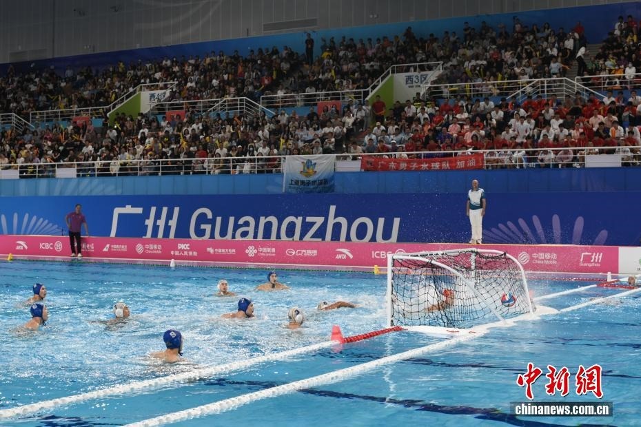 10月27日晚,在廣東廣州舉行的第十五屆全國運動會水球男子組比賽金牌賽中,廣東隊(藍(lán)帽)以16比9戰(zhàn)勝上海隊(白帽),獲得金牌。圖為廣東隊進球得分。