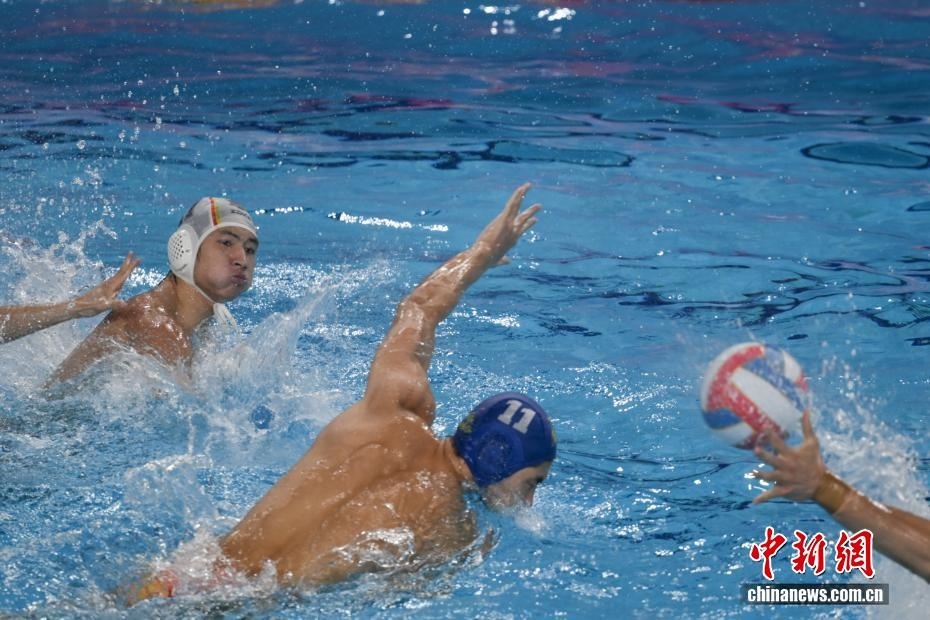 10月27日晚,在廣東廣州舉行的第十五屆全國運動會水球男子組比賽金牌賽中,廣東隊以16比9戰(zhàn)勝上海隊,獲得金牌。圖為上海隊11號運動員蔡宇浩(白帽)在比賽中進攻。