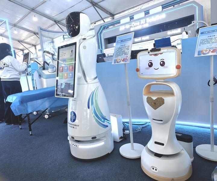 這是在第八屆世界聲博會(huì)上展出的長者陪伴機(jī)器人(右)(11月3日攝)。新華社記者 汪海月 攝