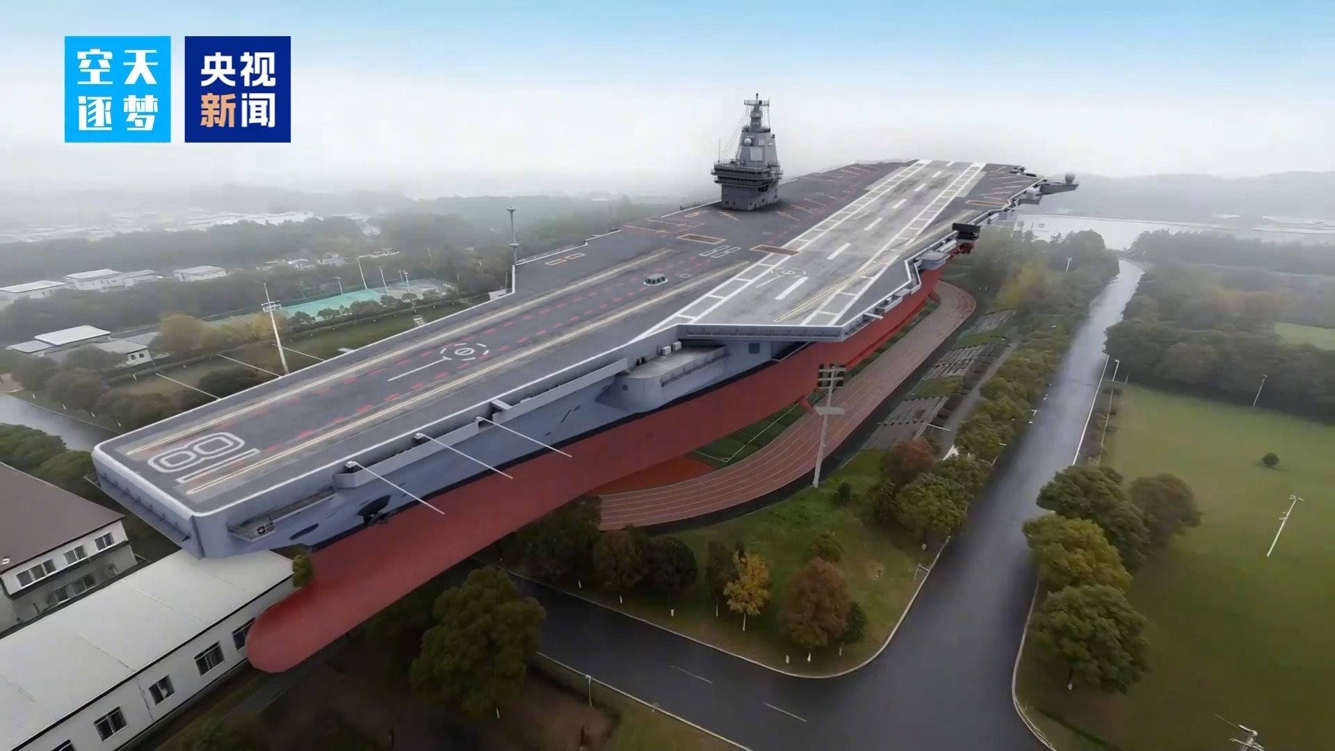 四年前,我們曾拍攝山東艦,但鏡頭未能充分展現(xiàn)其五萬噸的磅礴體量。如今,福建艦更大,如何讓人直觀感受?我們選擇將它“置于”陸地,在熟悉場景中體會其宏偉。