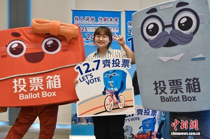 10月23日,香港特區(qū)政府和選舉管理委員會舉行2025年立法會換屆選舉啟動禮,為第八屆立法會選舉揭開序幕。圖為一名女士與“票箱家族”角色合影?!≈行律缬浾?李志華 攝