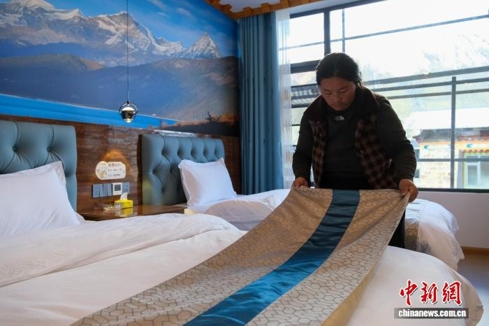 11月9日,西藏林芝巴松措景區(qū)結(jié)巴村村民索朗拉姆整理客房。她的客棧擁有15間客房。中新社記者 江飛波 攝