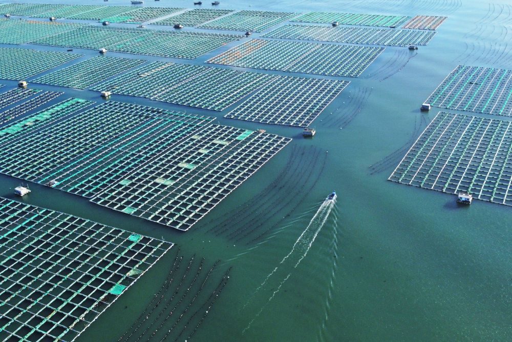 ↑ 11月10日,在山東省榮成市桑溝灣海洋牧場,養(yǎng)殖工人在養(yǎng)殖區(qū)穿梭作業(yè)(無人機照片)。新華社發(fā)(王福東 攝)