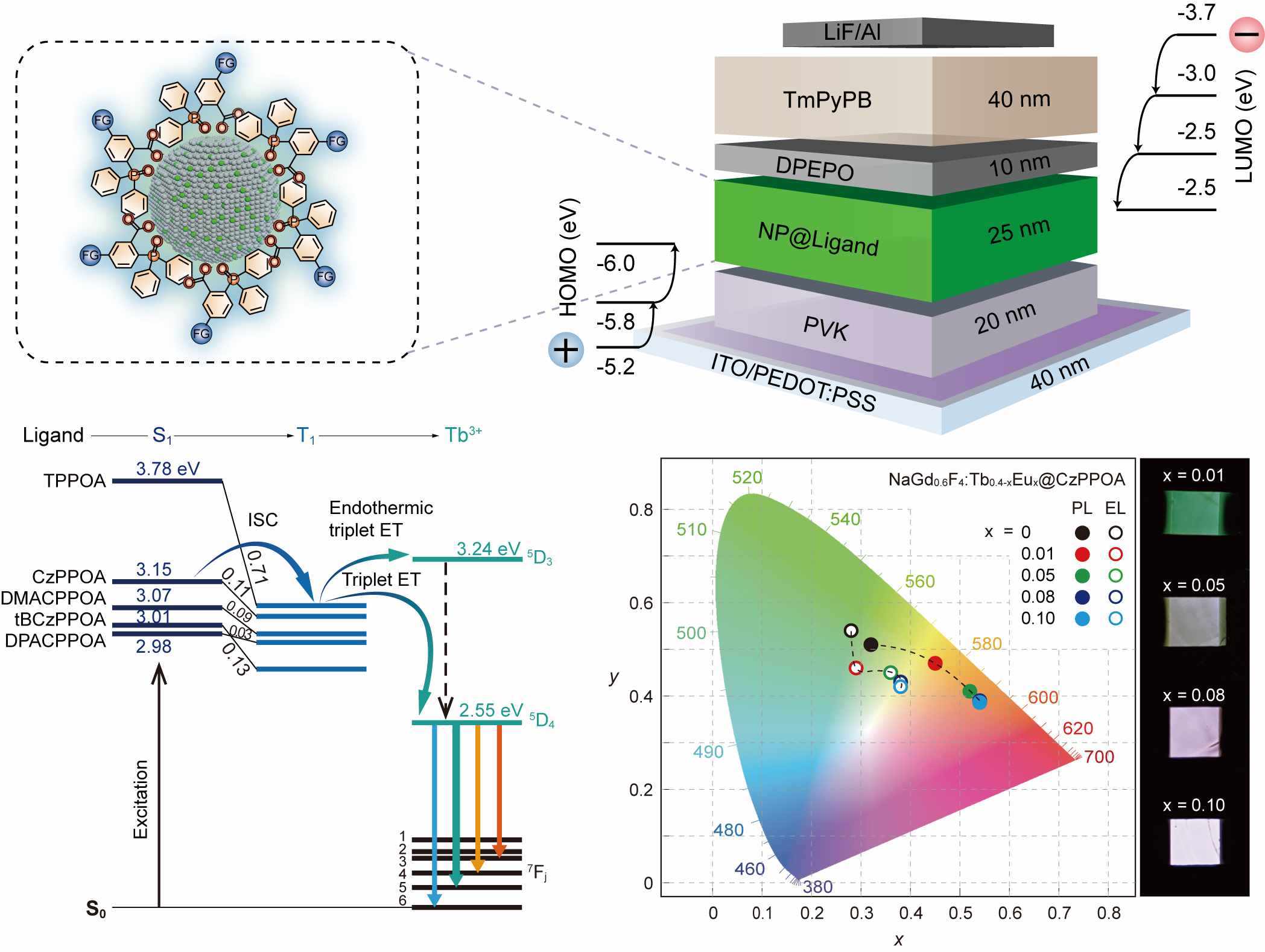 面對(duì)這一制約稀土材料邁向高端應(yīng)用的瓶頸,研究團(tuán)隊(duì)開創(chuàng)性地提出有機(jī)半導(dǎo)體敏化策略,以功能化有機(jī)配體作為“光電橋梁”,成功將能量精準(zhǔn)高效地傳遞給絕緣稀土納米晶,實(shí)現(xiàn)了電流驅(qū)動(dòng)下的高效發(fā)光。