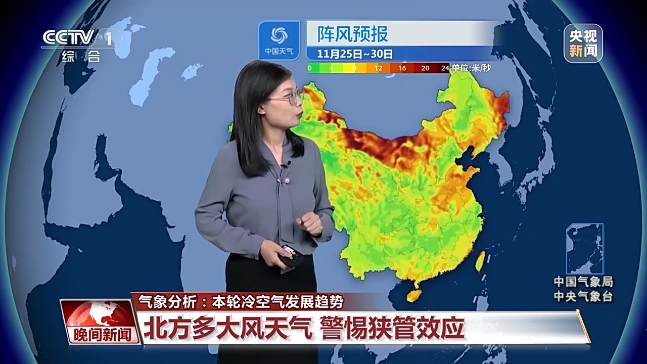 氣象分析師 孫倩倩:本周冷空氣頻繁,會(huì)導(dǎo)致各地氣溫多波動(dòng)起伏,同時(shí)天氣干燥多風(fēng)。眼下這輪冷空氣24日重點(diǎn)影響的是北方,尤其是在偏北的地區(qū)降溫是比較猛烈的。同時(shí)從內(nèi)蒙古中部到河南山東一帶還伴隨著6級(jí)以上的大風(fēng),局部地區(qū)陣風(fēng)達(dá)到了10~11級(jí)。