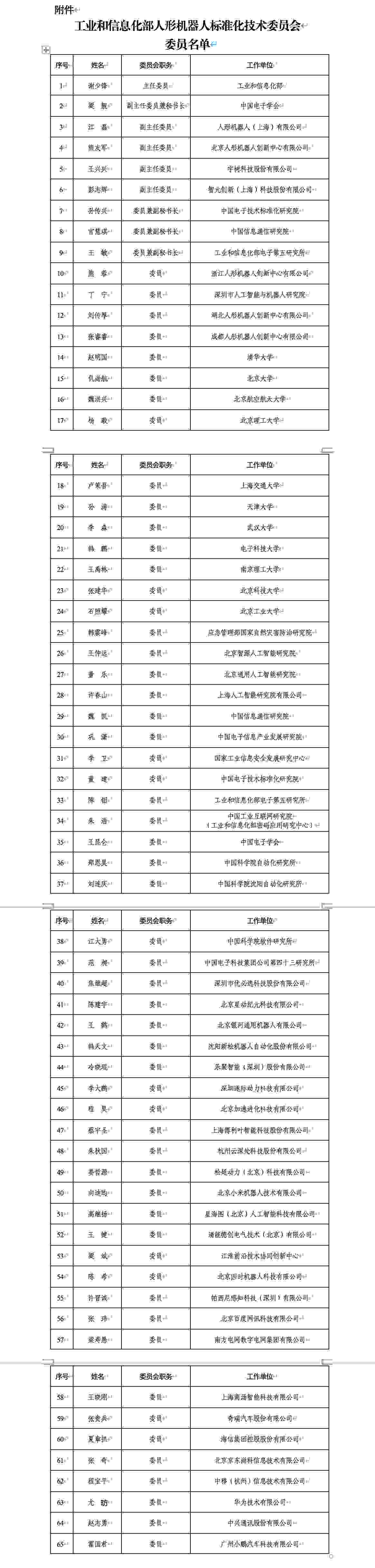 名單共包括65人,其中工業(yè)和信息化部謝少鋒為主任委員,中國電子學(xué)會梁靚為副主任委員兼秘書長,人形機(jī)器人(上海)有限公司江磊、北京人形機(jī)器人創(chuàng)新中心有限公司熊友軍、宇樹科技股份有限公司王興興、智元創(chuàng)新(上海)科技股份有限公司彭志輝為副主任委員,中國電子技術(shù)標(biāo)準(zhǔn)化研究院孫傳興、中國信息通信研究院宮慧琪、工業(yè)和信息化部電子第五研究所王敏為委員兼副秘書長。