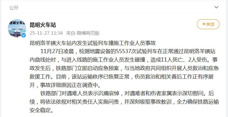 據(jù)昆明鐵路局昆明站官方微博消息,11月27日凌晨,檢測(cè)地震設(shè)備的55537次試驗(yàn)列車在正常通過昆明洛羊鎮(zhèn)站內(nèi)曲線處時(shí),與進(jìn)入線路的施工作業(yè)人員發(fā)生碰撞,造成11人死亡、2人受傷。事故發(fā)生后,鐵路部門立即啟動(dòng)應(yīng)急預(yù)案,與當(dāng)?shù)卣餐M織開展人員救治和應(yīng)急救援工作。目前,該站運(yùn)輸秩序已恢復(fù)正常,傷員救治和相關(guān)善后工作正有序展開,事故詳細(xì)原因正在調(diào)查中。