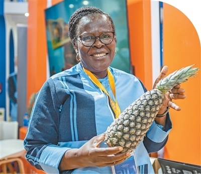 在第八屆進(jìn)博會(huì)國家綜合展上,貝寧國家館的工作人員展示貝寧奶油菠蘿。