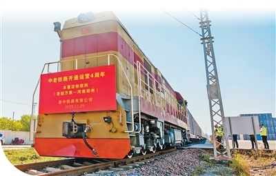 11月29日,一列滿載1000噸木薯淀粉的鐵路集裝箱班列從中老鐵路萬象南站駛出,準(zhǔn)備發(fā)往河南鄭州。這是老撾首次成列運(yùn)輸輸華的木薯淀粉。凱 喬攝(新華社發(fā))