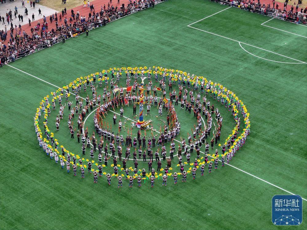 ↑11月29日,表演者在融水縣民族體育公園舉行的蘆笙斗馬節(jié)開(kāi)幕式現(xiàn)場(chǎng)表演蘆笙踩堂(無(wú)人機(jī)照片)。新華社發(fā)(鄭昌昊攝)