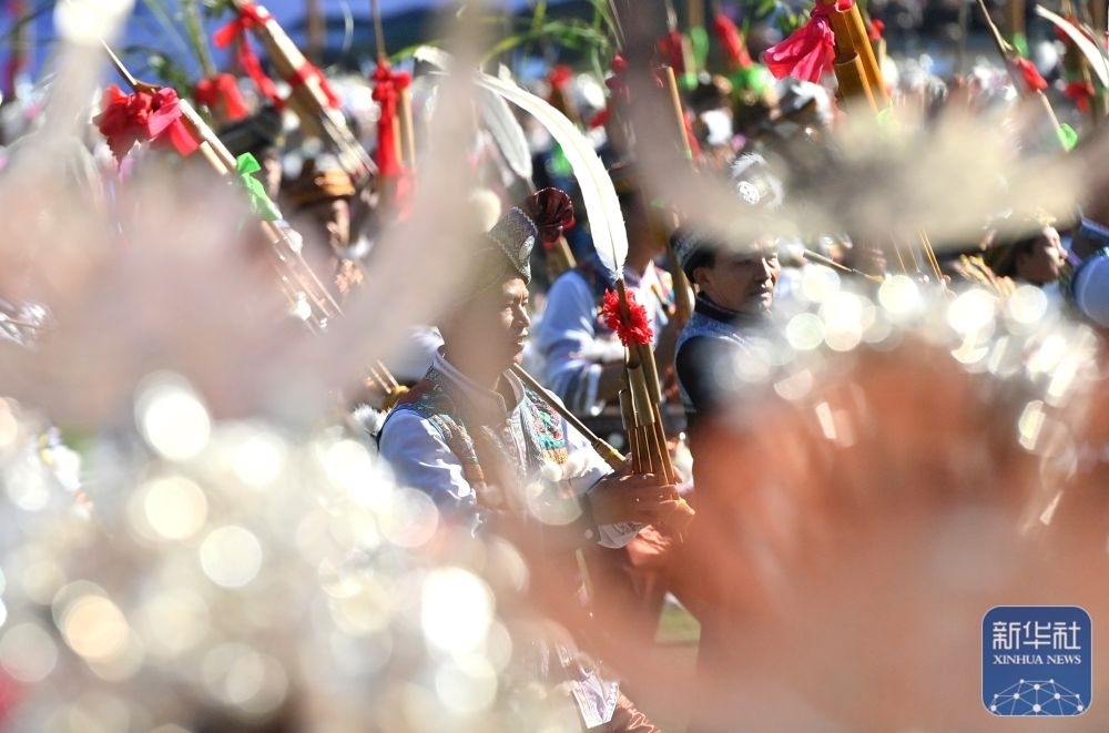 ↑11月29日,表演者在融水縣民族體育公園舉行的蘆笙斗馬節(jié)開(kāi)幕式現(xiàn)場(chǎng)吹奏蘆笙。新華社記者 黃孝邦 攝