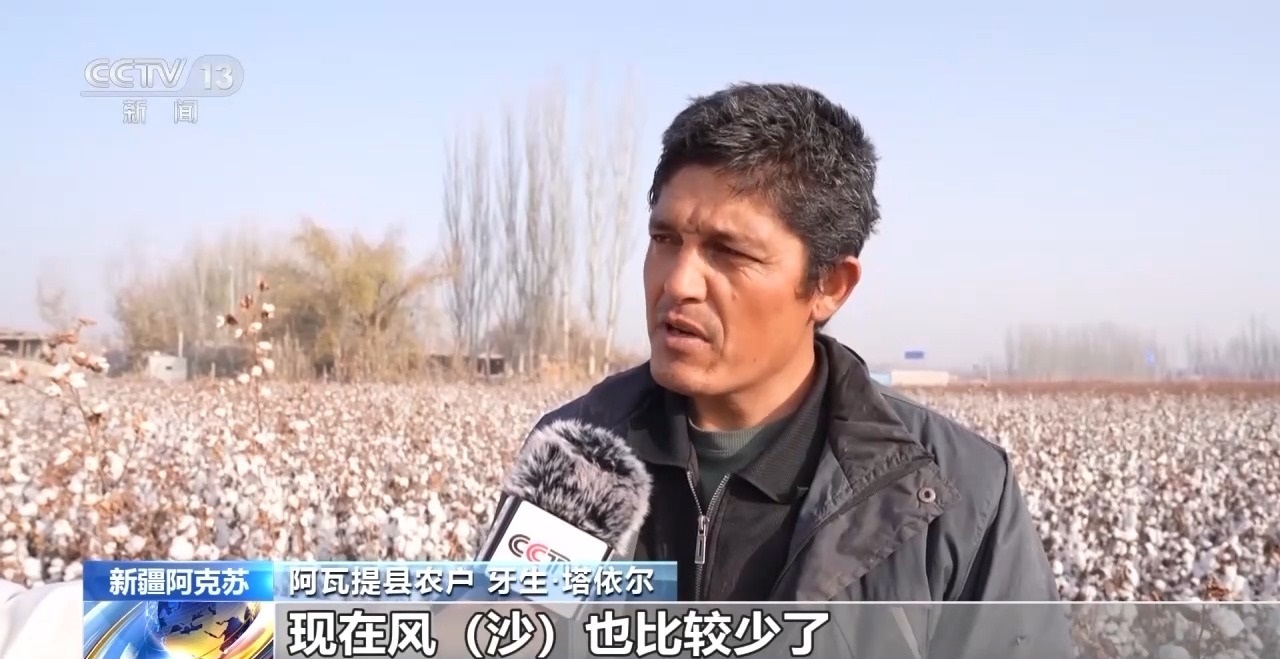 阿瓦提縣農(nóng)戶 牙生·塔依爾:種樹(shù)之后天氣變得很好,現(xiàn)在風(fēng)沙也比較少了,棉花白白的,以前棉花上黃黃的,土太多了,以前一畝地200到250公斤,現(xiàn)在350公斤。