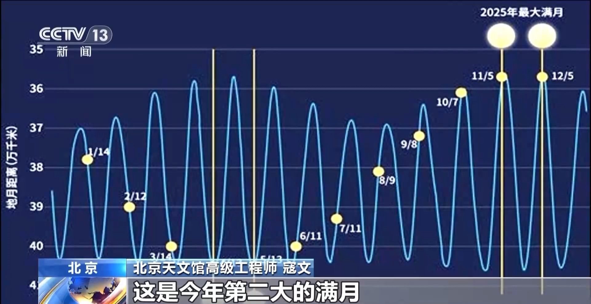 北京天文館高級工程師 寇文:12月5日大約早晨7點(diǎn)14分是滿月,而月亮過近地點(diǎn)的時間是在這之前大約12個小時,這是今年第二大的滿月,也可以算是一次“超級月亮”。