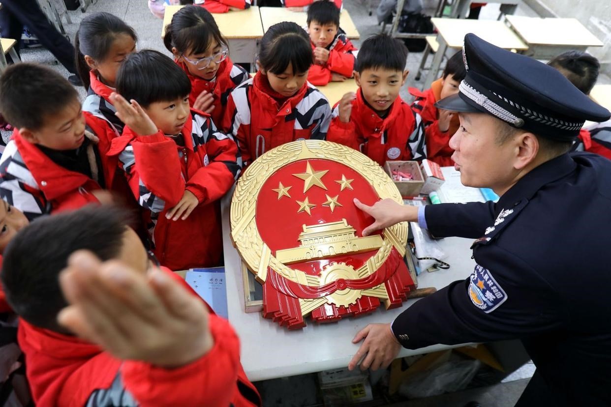 12月4日,民警在江蘇省泰州市海陵區(qū)九龍實(shí)驗(yàn)學(xué)校給學(xué)生講解憲法知識(shí)。當(dāng)?shù)兀ㄟ^咨詢、普法課堂等多種形式開展憲法宣傳教育活動(dòng),弘揚(yáng)憲法精神,提升公民法治素養(yǎng)。(工人日?qǐng)?bào)通訊員 湯德宏 攝)