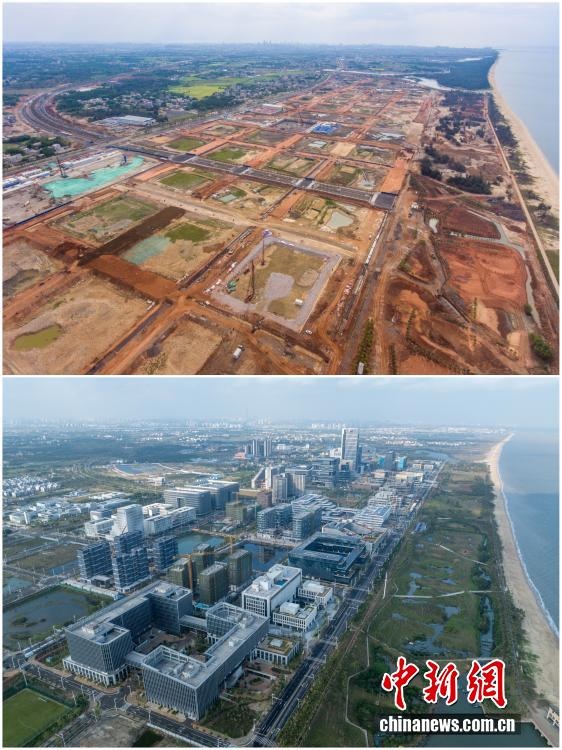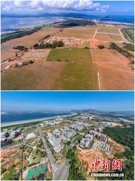 2025年12月18日,海南自由貿(mào)易港正式啟動全島封關(guān)。近年來,海南自貿(mào)港建設(shè)在利好政策帶動下不斷刷新“自貿(mào)港速度”,一個個重大項目、重點園區(qū)拔地而起,直觀呈現(xiàn)海南自貿(mào)港的蓬勃生機。這里正成為中國對外開放的新前沿、互利合作的新熱土和推動經(jīng)濟全球化的新引擎。上資料圖為2020年8月19日俯瞰三亞崖州灣科技城高新區(qū)建設(shè)現(xiàn)場,下資料圖為2025年12月9日已初具規(guī)模的三亞崖州灣科技城高新區(qū)。(拼版圖,無人機照片)