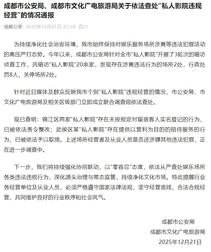 據(jù)“成都公安”微信公眾號消息,12月21日晚,成都市公安局、成都市文化廣電旅游局發(fā)布關(guān)于依法查處“私人影院違規(guī)經(jīng)營”的情況通報:今年以來,成都市公安局針對全市“私人影院”開展了3輪次的暗訪偵查工作,共暗訪“私人影院”20余家,發(fā)現(xiàn)存在涉黃違法行為的場所2處,行政處罰8人,關(guān)停場所2處。