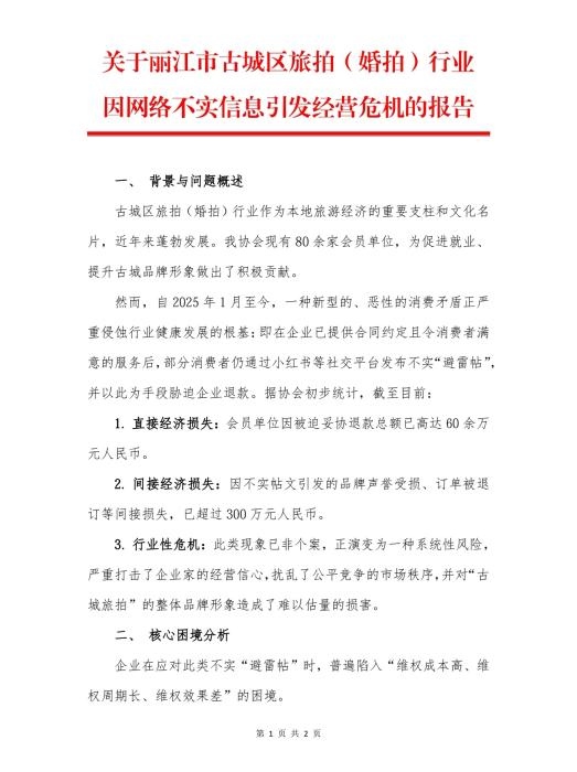 今年10月,麗江市古城區(qū)旅拍行業(yè)協(xié)會(huì)發(fā)布的《關(guān)于麗江市古城區(qū)旅拍(婚拍)行業(yè)因網(wǎng)絡(luò)不實(shí)信息引發(fā)經(jīng)營(yíng)危機(jī)的報(bào)告》。