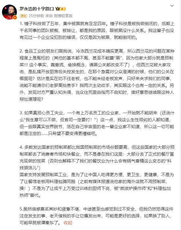 1月16日,@羅永浩的十字路口 再次發(fā)長(zhǎng)文回應(yīng)西貝賈國(guó)龍近日的言論。他表示,錘子科技做了五年,集中被黑就有足足四年。錘子科技是被我做倒閉的,后期上千名同事的團(tuán)隊(duì)被裁、被轉(zhuǎn)讓?zhuān)际俏业脑?,跟被黑沒(méi)什么關(guān)系。我這輩子也沒(méi)有見(jiàn)過(guò)一個(gè)企業(yè)沒(méi)犯別的錯(cuò)誤,僅僅是因?yàn)楸缓?,就能倒閉的。