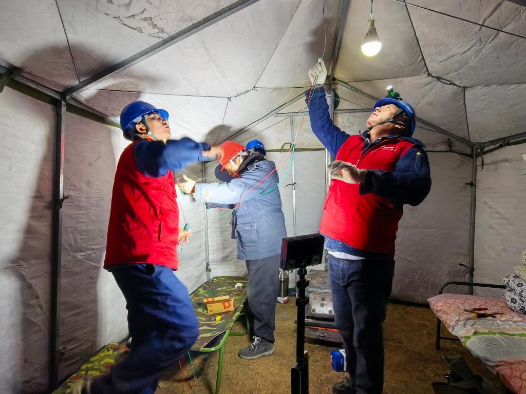 1月26日晚,國網甘南供電公司工作人員為臨時安置點應急帳篷接電。(國網甘南供電公司供圖)
