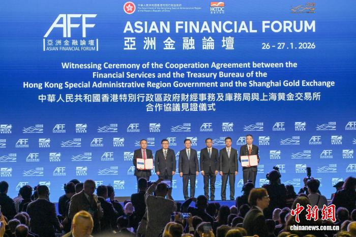 1月26日,在香港揭幕的第19屆亞洲金融論壇上,香港特區(qū)政府財經事務及庫務局與上海黃金交易所簽署合作協(xié)議,推動兩地黃金市場合作。圖為香港特區(qū)行政長官李家超(左三)、中國人民銀行副行長鄒瀾(右三)等嘉賓見證簽署合作協(xié)議?!≈行律缬浾?陳永諾 攝