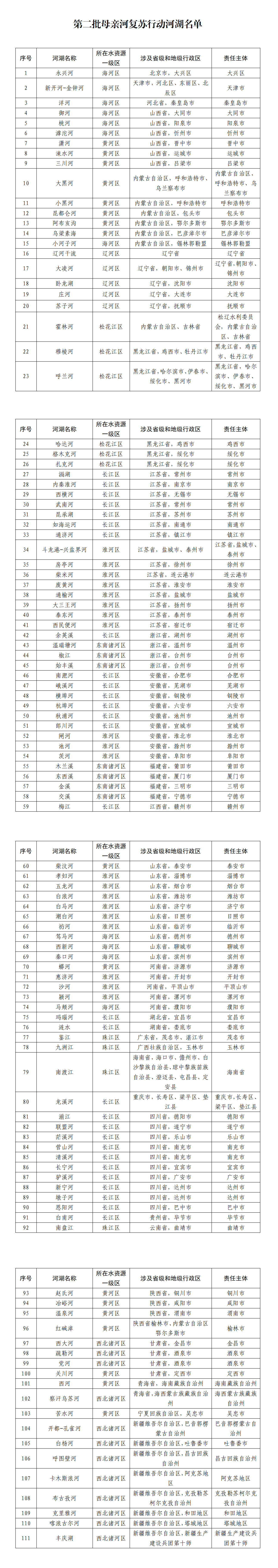 2022年以來,水利部圍繞解決河道斷流、湖泊萎縮干涸問題,在全國率先選取了88條(個)河(湖)開展母親河復(fù)蘇行動。為進一步擴大母親河復(fù)蘇行動范圍,水利部聚焦河道斷流、湖泊萎縮、水動力不足等問題,全面分析河湖水資源、水生態(tài)狀況,將復(fù)蘇需求迫切、具有復(fù)蘇可行性的111條(個)河(湖)納入第二批母親河復(fù)蘇行動,涉及29個省份和新疆生產(chǎn)建設(shè)兵團。