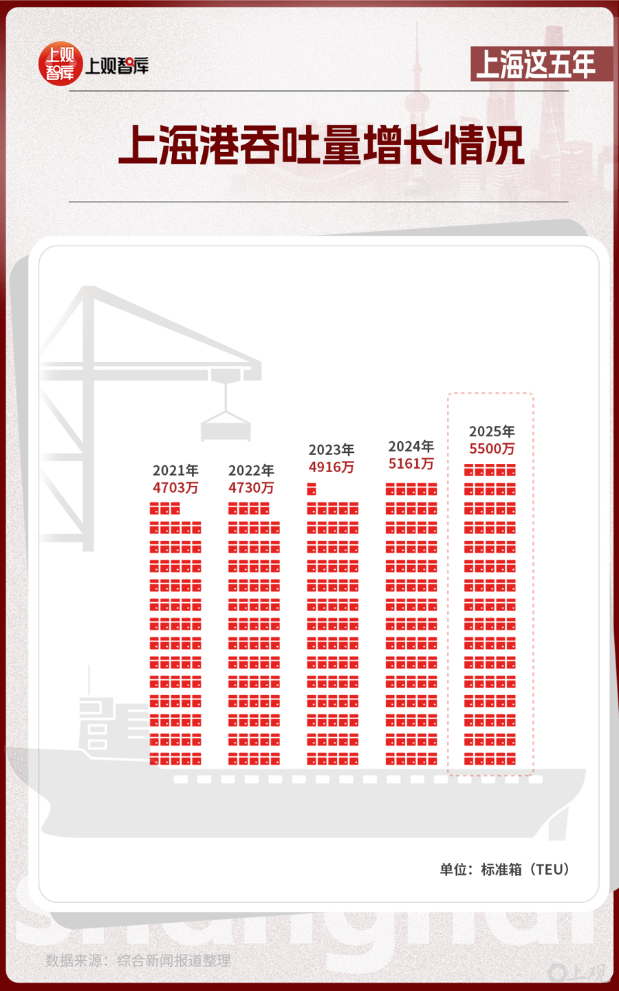 2024年,上海浦東國(guó)際機(jī)場(chǎng)首次排名全國(guó)旅客吞吐量第一,榮登中國(guó)最繁忙的機(jī)場(chǎng)。也是在這一年,上海港成為全球首個(gè)年吞吐量超過5000萬標(biāo)準(zhǔn)箱的世界大港。