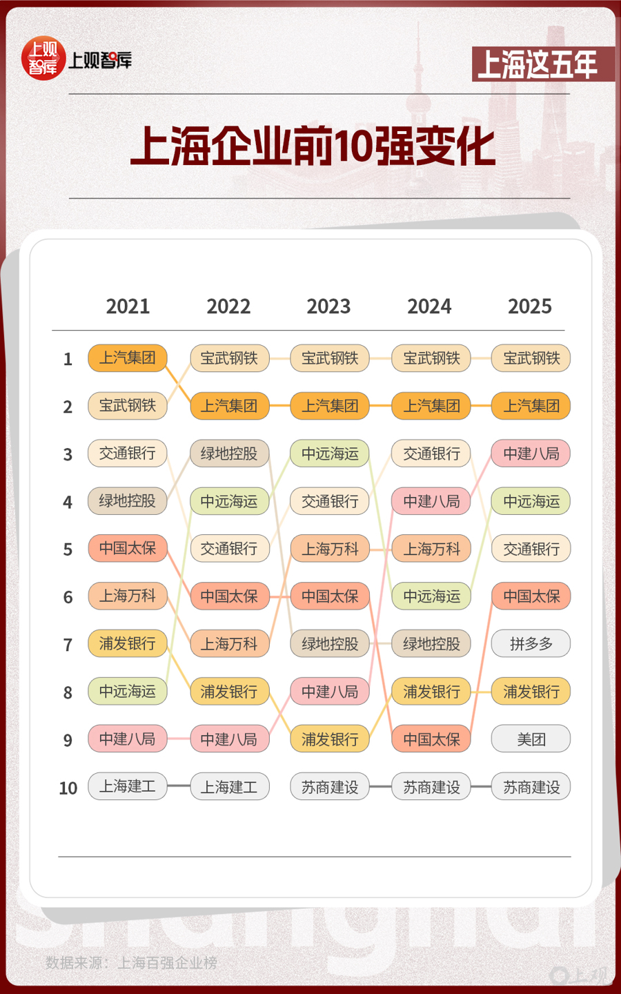 這份由上海市企業(yè)聯(lián)合會(huì)、上海市企業(yè)家協(xié)會(huì)、上海市經(jīng)濟(jì)團(tuán)體聯(lián)合會(huì)和解放日?qǐng)?bào)社共同發(fā)布的榜單,從2021年到2025年,見證了傳統(tǒng)企業(yè)的轉(zhuǎn)型與創(chuàng)新企業(yè)的涌現(xiàn)。在前10強(qiáng)的名單中,制造業(yè)仍然是上海產(chǎn)業(yè)的壓艙石,而房地產(chǎn)、建筑企業(yè)從2021年占比達(dá)40%,到2025年占比降低為20%。互聯(lián)網(wǎng)企業(yè)在2025年沖上前10強(qiáng),并占據(jù)了20%的席位,亮出了上海經(jīng)濟(jì)多元發(fā)展的成績(jī)單。