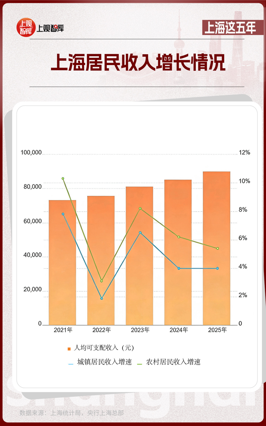 2025年,上海人均可支配收入超過了9萬元,對(duì)比2021年增長(zhǎng)了17.9%;人均消費(fèi)支出逼近5.5萬元,對(duì)比2021年增長(zhǎng)了12.0%;全市社會(huì)消費(fèi)品零售總額增長(zhǎng)4.6%。