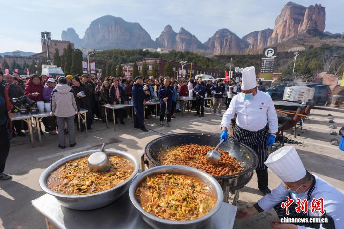 除了非遺展區(qū),在場(chǎng)地一側(cè)安排的“千人百桌宴”也提前烘托出濃濃年味。偌大的場(chǎng)地內(nèi),10人一桌的圓桌分4列排開(kāi),近千人同時(shí)用餐,“大燴菜、開(kāi)花饃,廚師現(xiàn)場(chǎng)制作的飯菜熱氣騰騰,胃口一下就打開(kāi)了”。