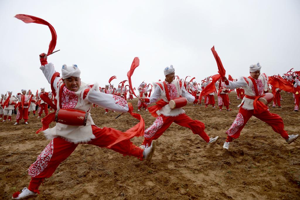 腰鼓手在陜西省延安市安塞區(qū)南溝村進(jìn)行一場山地腰鼓演出。新華社記者 劉瀟 攝