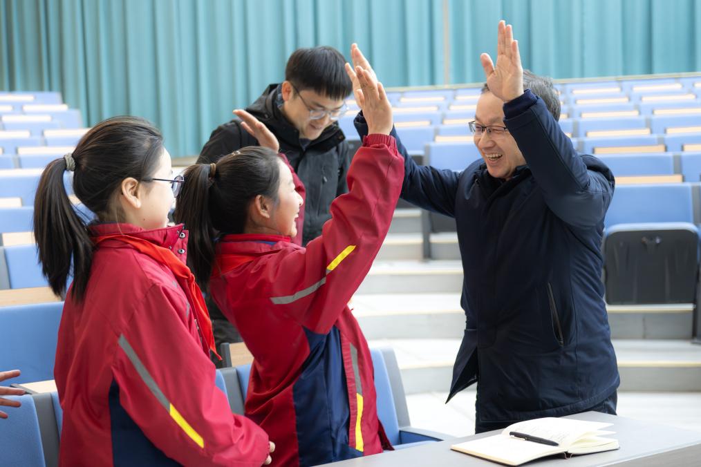 在紅安縣將軍城小學(xué),記者與參加思政示范課的小學(xué)生擊掌互動。新華社記者 肖藝九 攝