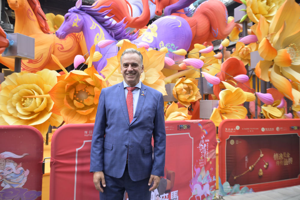 烏拉圭總統(tǒng)奧爾西2月5日在上海豫園迎接農(nóng)歷新年的奔馬花燈前留影。新華社記者 高峰 攝