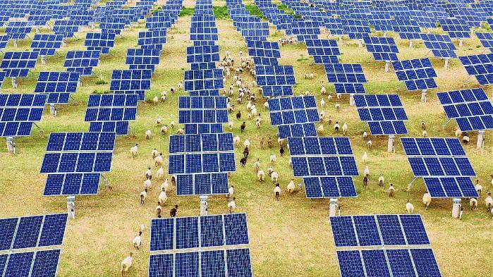 短短數(shù)年,塔拉灘上豎起了一排排整齊劃一的光伏板,更令人驚喜的是,光伏板下的沙地漸漸換上了“綠裝”——耐陰耐旱的牧草茁壯成長(zhǎng),羊群在板間悠然覓食,一幅綠電與生態(tài)共生的活力圖景徐徐展開。
