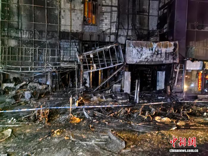 29日1時許,起火建筑物東側樓體外墻可見大面積燃燒痕跡,緊鄰通道的幾間門面房過火,受損嚴重。門面房前邊有多輛電動自行車被燒成鐵架子。