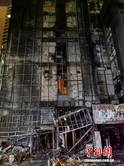 圖為大面積過火后的建筑東側樓體外墻。 陸祁國 攝