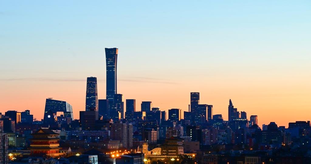 2025年11月27日清晨拍攝的北京正陽門城樓、正陽門箭樓和遠(yuǎn)處的CBD建筑群。新華社記者 陳曄華 攝