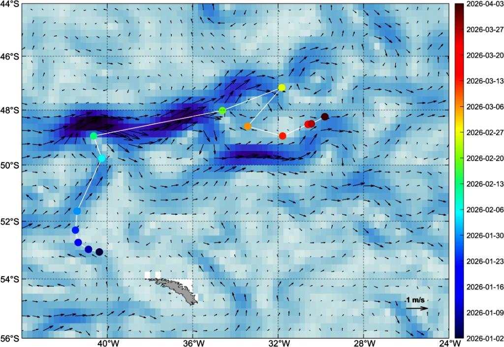 風(fēng)云衛(wèi)星監(jiān)測的A23a冰山漂移路徑(圓點(diǎn)為冰山位置,時間與右側(cè)標(biāo)注對應(yīng);圖底色和箭頭表示洋流)。(中國氣象局供圖)