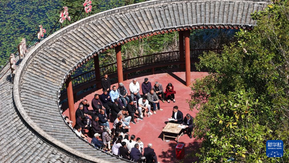 4月19日拍攝的泗洪縣上塘鎮(zhèn)墊湖村村民代表票決民生實(shí)事現(xiàn)場(chǎng)(無人機(jī)照片)。