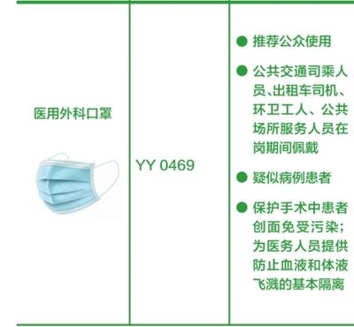 醫(yī)用外科口罩:防護效果優(yōu)于一次性使用醫(yī)用口罩,推薦公眾包括疑似病例患者、公共交通司乘人員、出租車司機、環(huán)衛(wèi)工人、公共場所服務人員在崗期間佩戴。該類型口罩還可保護手術(shù)中患者創(chuàng)面免受污染,可為醫(yī)務人員提供防止血液和體液飛濺的基本隔離。(橫列為口罩的圖片+名稱、產(chǎn)品標準、建議應用場景。圖片來源:中國疾控中心)